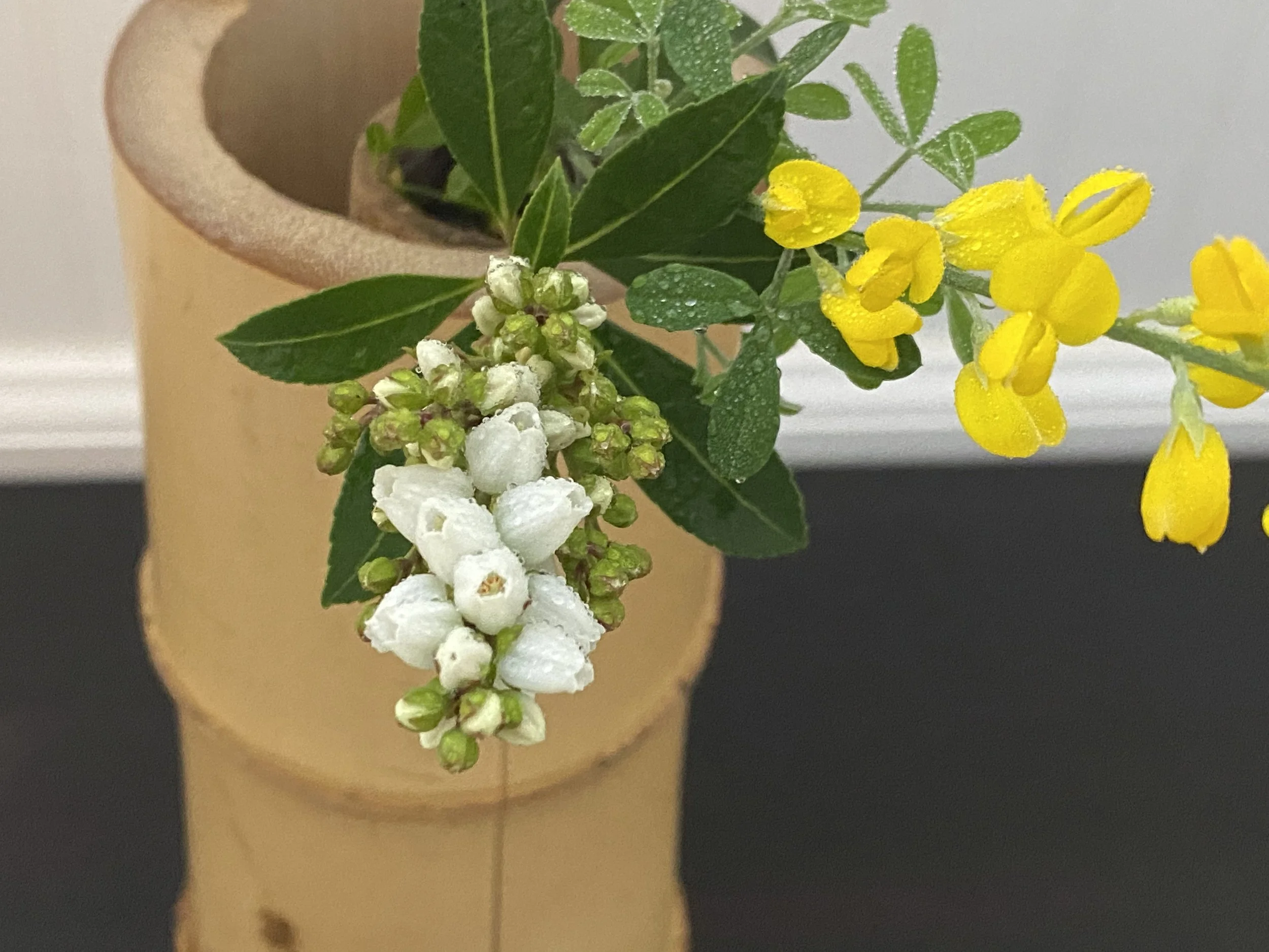 花:宵待草、鳴子百合 花入:膳所笹耳付