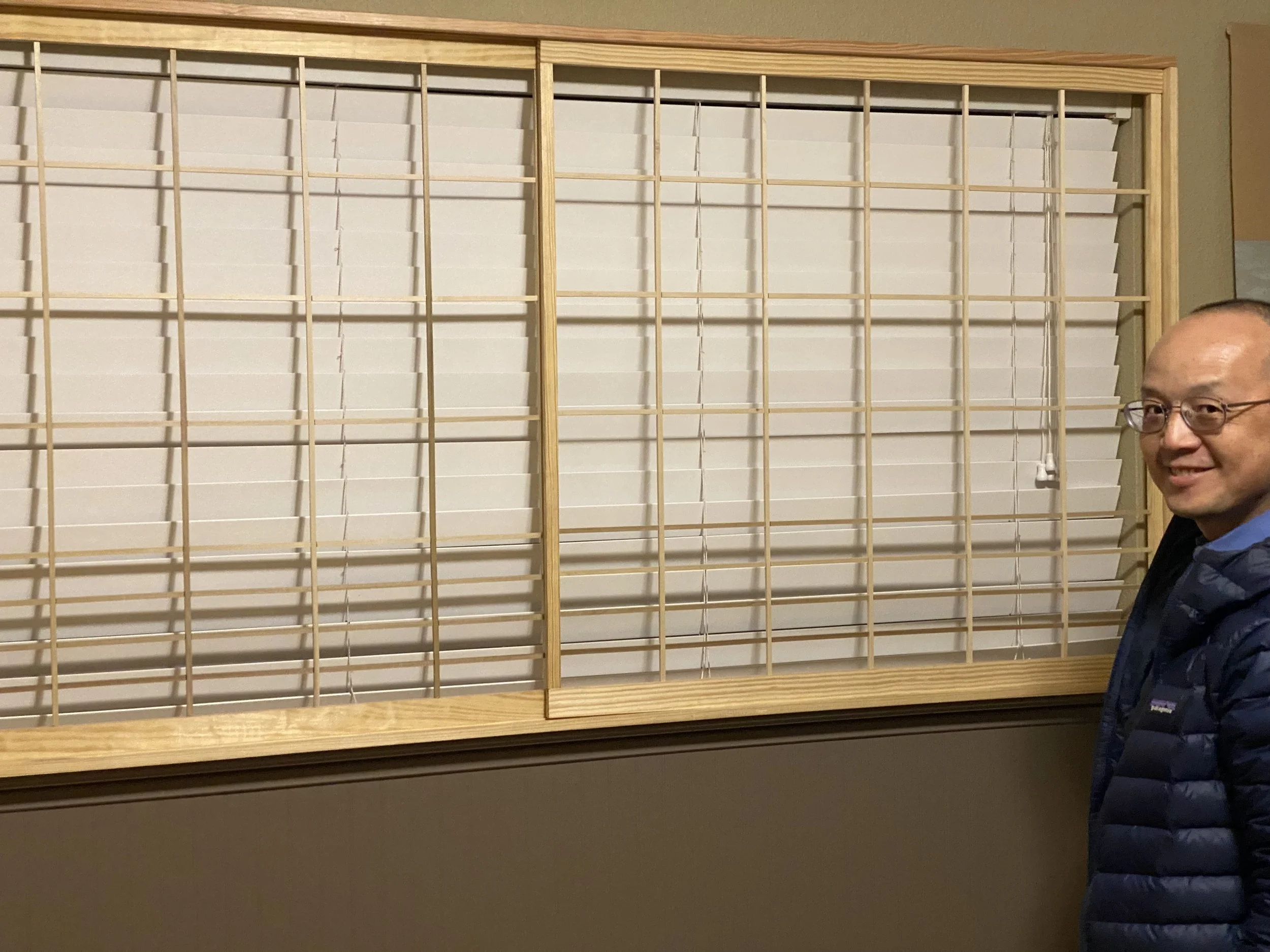 とりあえず、フレーム(枠組み)完了。 既存のブラインド(これは自動装置で太陽の光に合わせて開閉するようになってます)も残したい模様。障子紙もAmazonで取り寄せて、何とか貼れました。