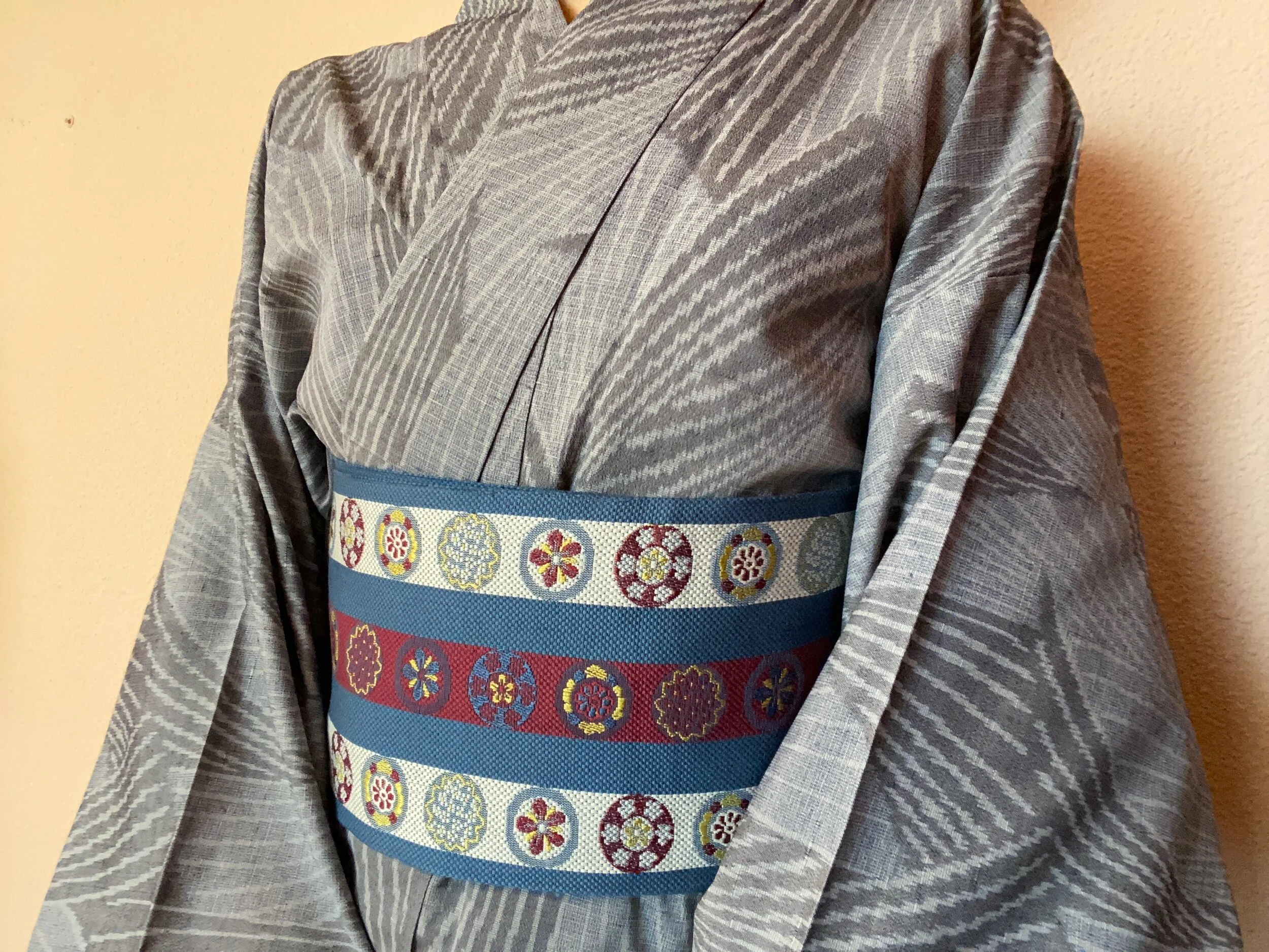 It is already October, and we are supposed to change to double layered awase kimono. However, the high temperature hits 93 F (34 C ), and it is another smoky day due to the wildfire up north. So, I just wear casual cotton kimono without hagajuban with han-haba obi. One more day to go !